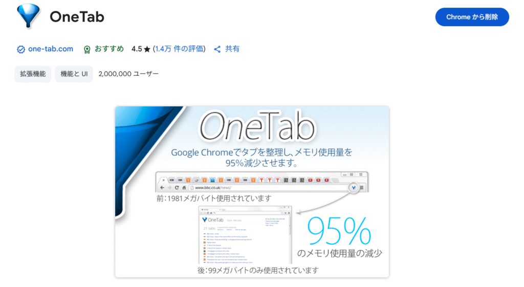 特にリサーチ中は、大量のタブが開くことも珍しくありません。タブがアイコンだけになると、どこに何を表示しているか分かりにくい上に、ブラウザの動作も重くなります。OneTabを使うと、グループにまとめられたタブのタイトル一覧を見て、すぐに必要なページを開くことができます。