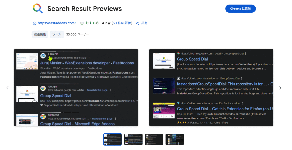 Google検索結果にサイトのサムネイルを表示し、ぱっと見でそのサイトのデザインを確認することができます。競合サイトがどのようなアイキャッチやタイトルを用いているのかを確認して、デザインの差別化を図ることができます。